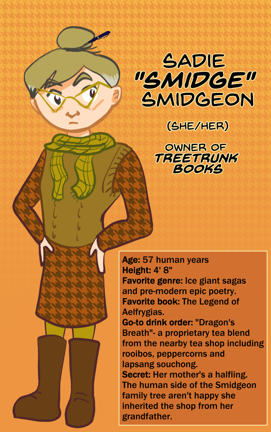Set near the fictional Bellvale University, Treetrunk Books centers on the only bookstore in the world that has grown around the mythical Tree of Knowledge—a rare tree whose golden apples absorb information from their surroundings. The shop is run by Sadie Smidgeon, affectionately known as Smidge, the great-granddaughter of founder Bernhard Mackindrod, who opened the store a century ago.