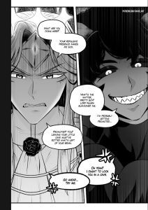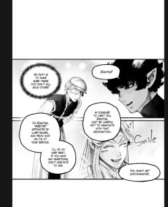 Since this comic is still in its early chapters, both Vio and Nox end up at each other’s throats a lot due to how both of them have different ways of doing their jobs. As seen in the first chapter, Vio wants to save certain people if he feels it isn’t their time, while Nox wants to go ahead and declare them dead. However, there is also little moments of peace that occur between them, since as when they sit under a giant blossom tree. Of course, the romantic and sexual tension makes things even more promising.