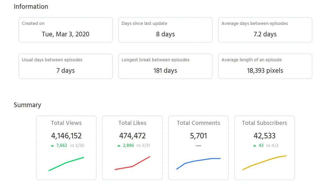 The stats tab only allows creators to see how many episodes the series has, as well as how many overall likes and current subscribers it’s gained. The only performance options one can see are Global Monthly PVs, Global PVs within the past 24 hours, and Average PVs per update—which depend on whether these stats are viewed within the current month and how they compare to the previous month.
