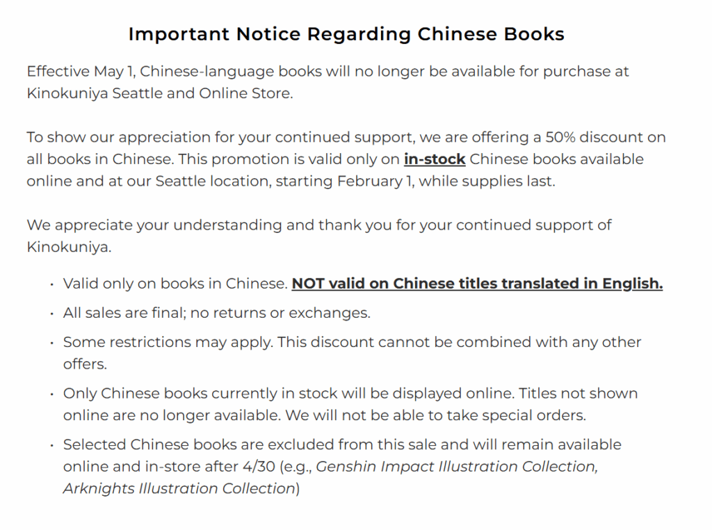 Kinokuniya Bookstore announced it will no longer carry Chinese-language books on its USA online store and at Kinokuniya Seattle starting May 1st, 2026. In a blog post, it clarified that certain books, such as artbooks like Genshin Impact: Official Art Book and Arknights Illustration Collection, will still be available. Other unaffected books include English translated Chinese books, such as Heaven Official’s Blessing and Grandmaster of Demonic Cultivation. Danmei fans, fret not as these books will still be available for purchase.