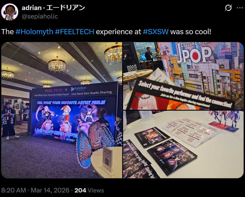 The idea is to create a stronger direct connection to their idols, which DOCOMO gave a special, immersive opportunity to those at SXSW. Those select few were able to experience an enhanced version of “oshi-katsu” culture, also known as stan culture, where a fan can devote time and money towards an idol or character (real or fictional). One attendee mentioned they were given a kiss by Ina, a member of hololive -Myth-, likely through the haptic technology in DOCOMO’s FEEL TECH ball. DOCOMO’s website described the technology’s selling point as giving fans the ability to “experience physical sensations synchronized to on-screen actions, including dynamic movements such as dancing and high-fives, as well as subtler sensations like heartbeats.”